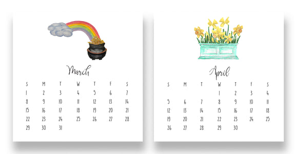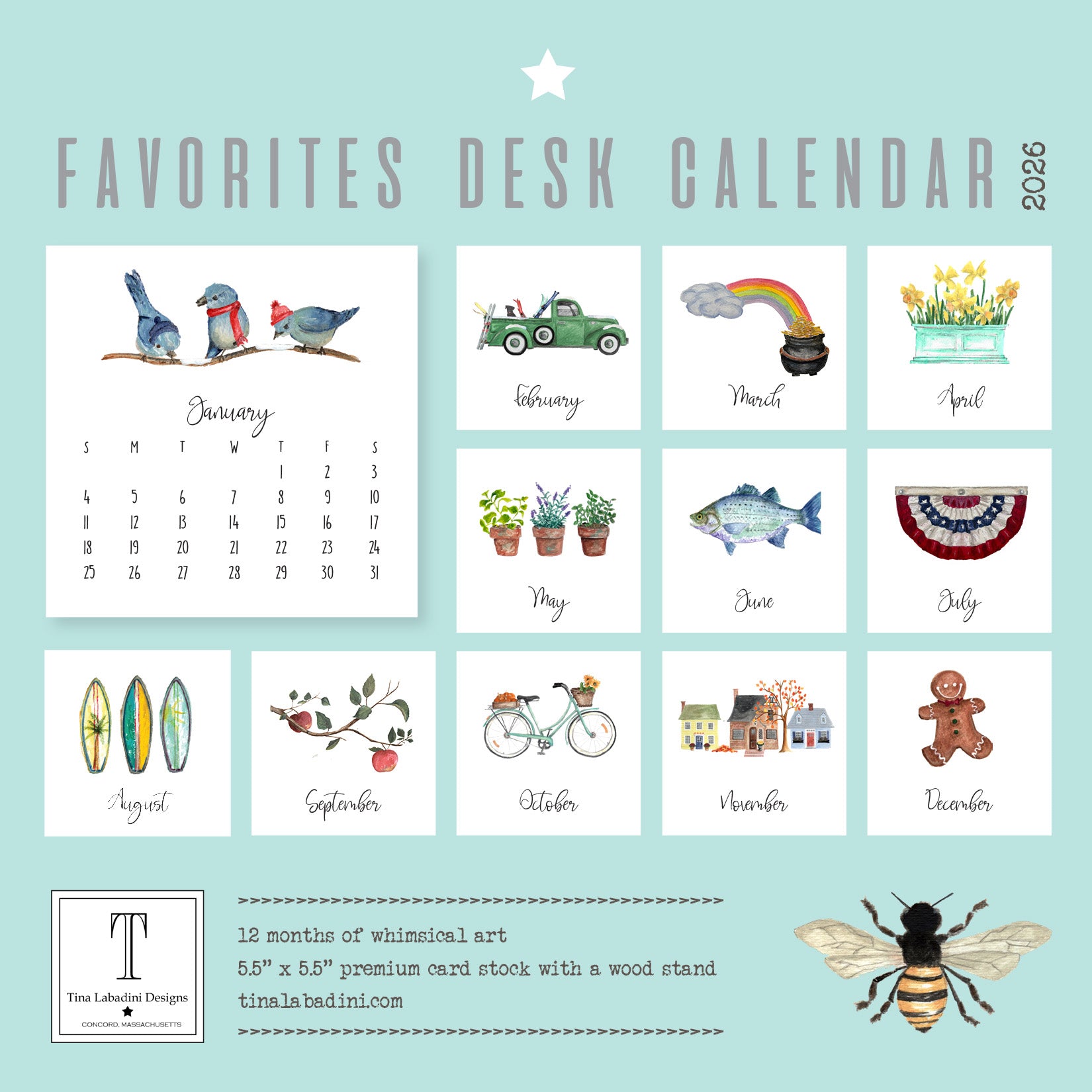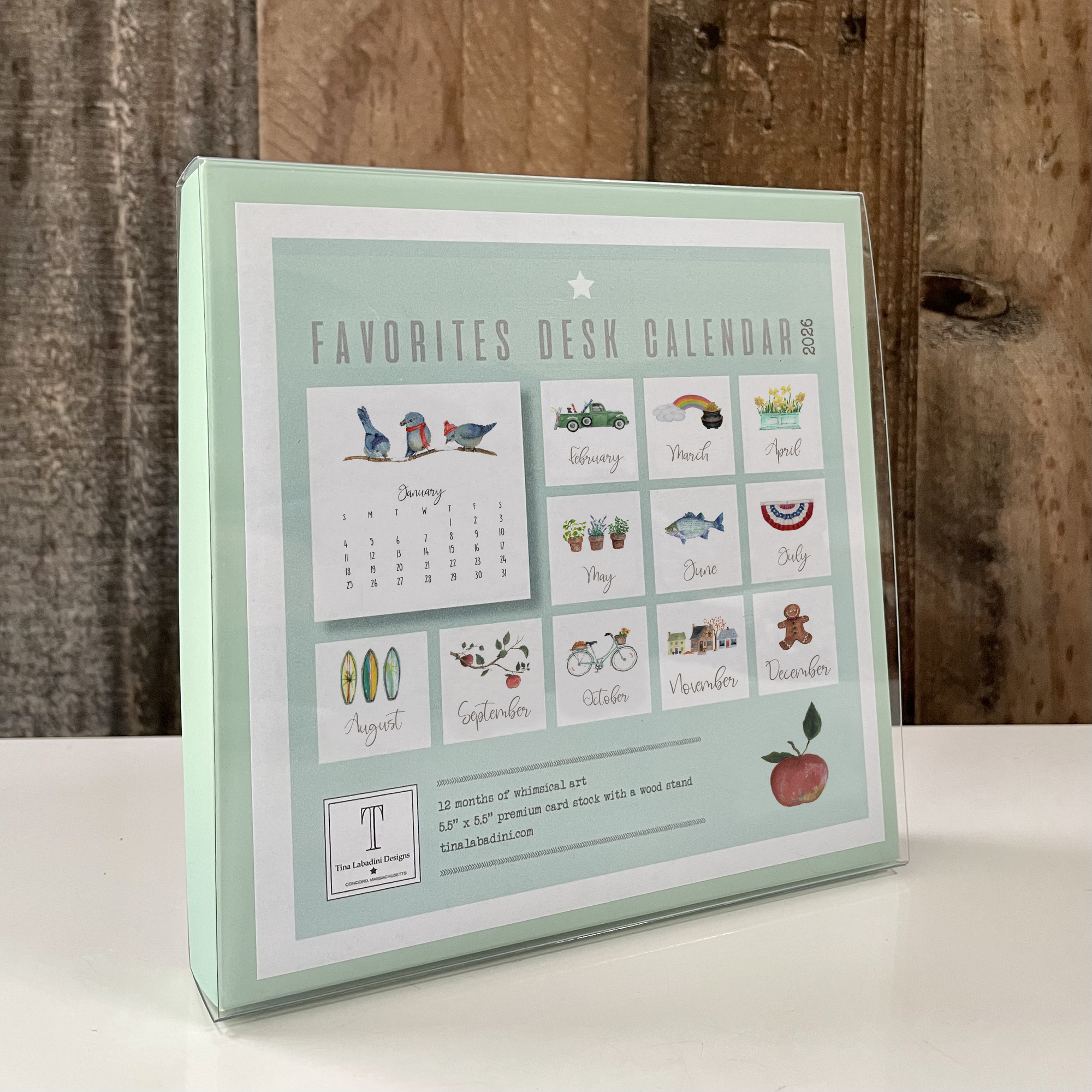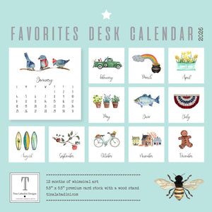 Our 2026 FAVORITES Desk Calendar shows the best of our art! This fun, whimsical art highlights some of the most fun parts of each season. The calendar sits nicely in a hand made wooden holder. Each month is 5.5" x 5.5" printed on new and improved high quality, 16 pt white cardstock. Beautifully packaged in a pretty seafoam box with a clear lid to make the perfect gift.